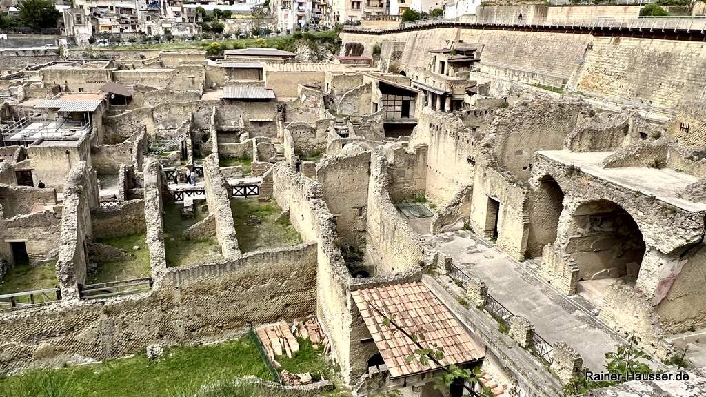 Wir wollen noch einen Tag bleiben und fahren zu einem anderen Stellplatz - genauer ein Agri Stellplatz. Wieder hinter hohen Mauern. Alles voll. Aber der Chef läßt uns trotzdem in dem Zufahrtsweg stehen, wenn wir morgen um 9 Uhr weg fahren. Ok. Von hier aus kann man zu Fuß zu den Ausgrabungen Ercolano gelangen. Mit Audio Guide schauen wir uns die Gemäuer an, die vom Vesuv verschüttet waren und mehrfach wieder aufgebaut wurden.