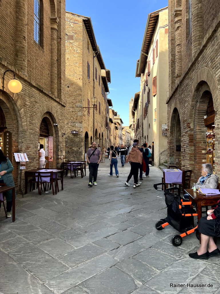 San Gimignano gefiel bei mir gut in den Facebook Reisebeschreibungen. Das wird das nächste Ziel. Vom Stellplatz gibt es einen kostenlosen Shuttlebus in den Ort. Der ist auf einem Berg in der toskischen Landschaft. Einfach malerisch. in den kleinen Gassen gibt es viele kleine Geschäfte. Alles natürlich sehr touristisch gepimpt. Aber sehr hübsch anzuschauen ist das allemal. Kurz bevor das ausgeguckte Restaurant schließt können wir noch eine Pizza ergattern. Auf dem Rückweg ist der Bus Fahrplan unklar. Wir laufen die zwei Kilometer zum Stellplatz. Auf den letzten Metern überholt uns dann doch noch der Shuttlebus. Anyway. Schöner Spaziergeng. Ein Tag reicht auch hier. Morgen geht es nach Siena.